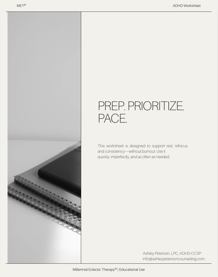 Prep, Prioritize, Pace is a Millennial Eclectic Therapy® (MET)–informed ADHD worksheet designed to help you achieve sustainable focus and goal-setting. This guided tool emphasizes structure, reflection, and self-compassion, providing a holistic approach to productivity that values rest and self-care.